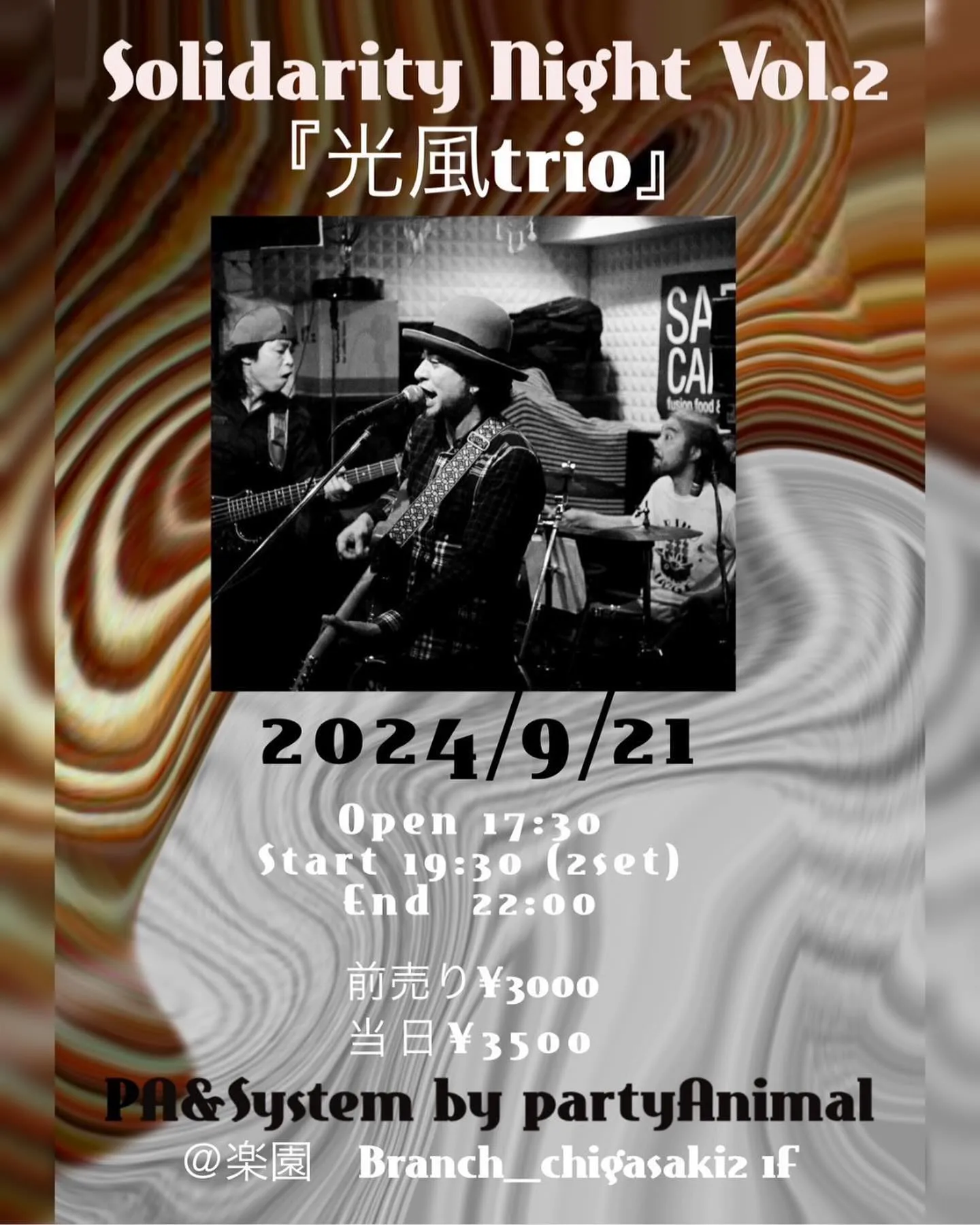 【🔥9月の楽園LIVE Vol.2🔥】 【🔥9月の楽園LIVEVol.2🔥】◎9月21日(土)『光風Torio』(アーティスト情報は下↓に)〜SolidarityNightVol.2〜待ってました〜〜😁またまたPA&SoundSystemのご協力のもと楽園に光風トリオ来ます‼️知ってる人は…